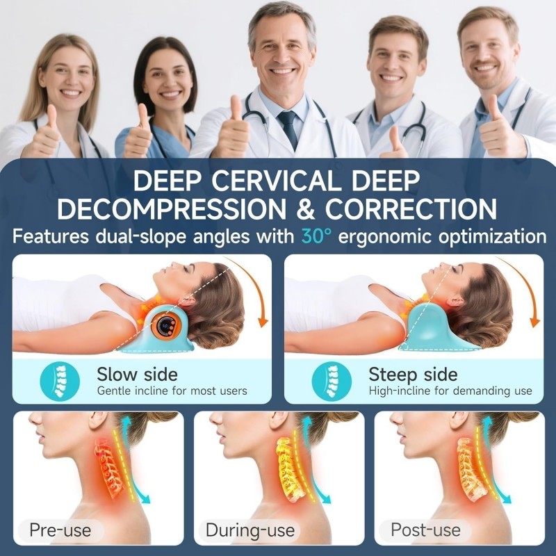 Ergonomic Design & Premium Materials - Crafted with skin-friendly silicone, this neck traction device is designed to naturally fit the contours of your neck. The advanced 3D design features dual-angle support (30° for gentle stretching and 45° for deeper extension) to maintain proper spinal alignment while providing comfortable stretching.