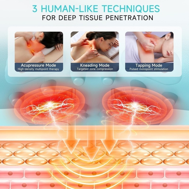 3 IN 1 Relaxation Experience - Experience the ultimate relaxation with our 3-in-1 neck massager with heat featuring 6 adjustable intensity levels and 3 professional automatic massage techniques modes – Shiatsu, Kneading, and Tapping. The focused compression for specific areas, deep kneading that works out stubborn tension, and rhythmic tapping for overall relaxation. The 3-level heat therapy and 3 vibration modes work together to provide deep muscle relief.