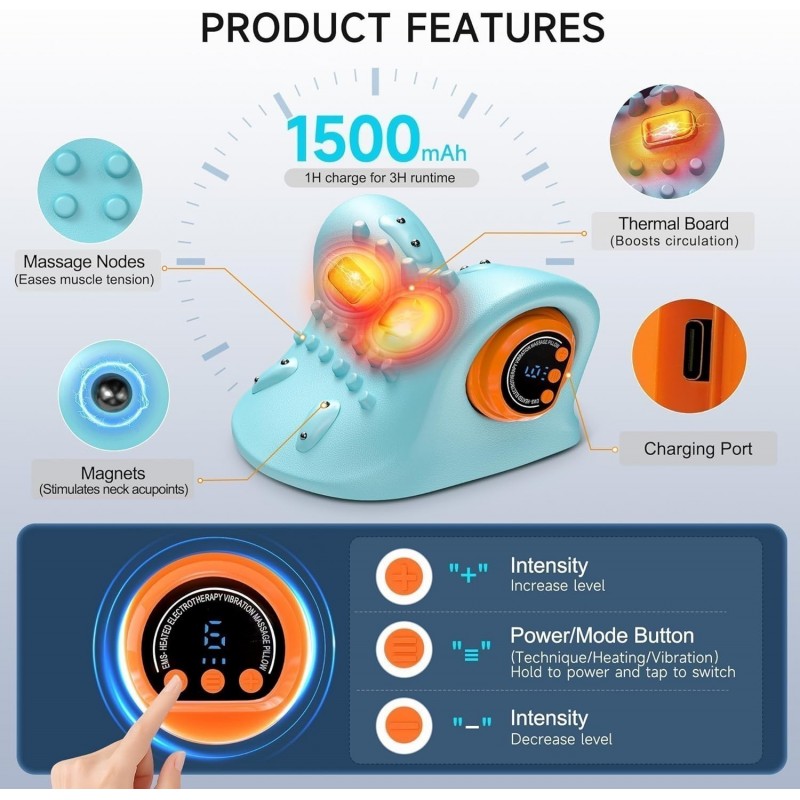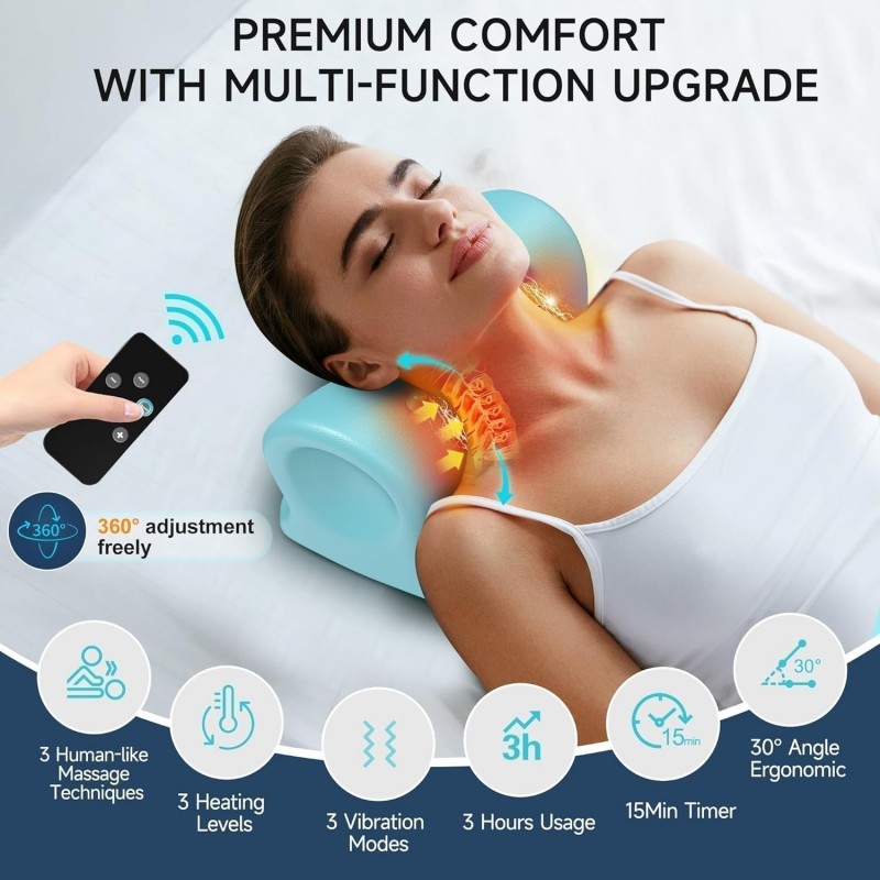Safe & Control at Your Fingertips - Equipped with a 360-degree remote control, this massager for neck and shoulder pain lets you adjust settings even with your eyes closed without disrupting your zen mode. In addition, with a 1500mAh battery that runs for 3 hours and an automatic 15-minute shut-off, you can nod off while unwinding, worry-free!